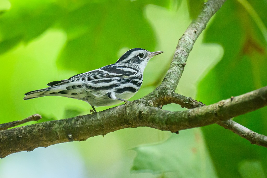Sure enough, the Eastern wood pewee did appear to feast on the bugs stirred up by my mower. As I was watching the pewee, another bird caught my eye. At first, I thought it was a white-breasted nuthatch, but as I watched closer and the bird came out into the light, I saw black and white stripes. It was a female Black and White Warbler. I had never seen this bird in my backyard in July before. What a backyard treat for a summer afternoon of birdtography.